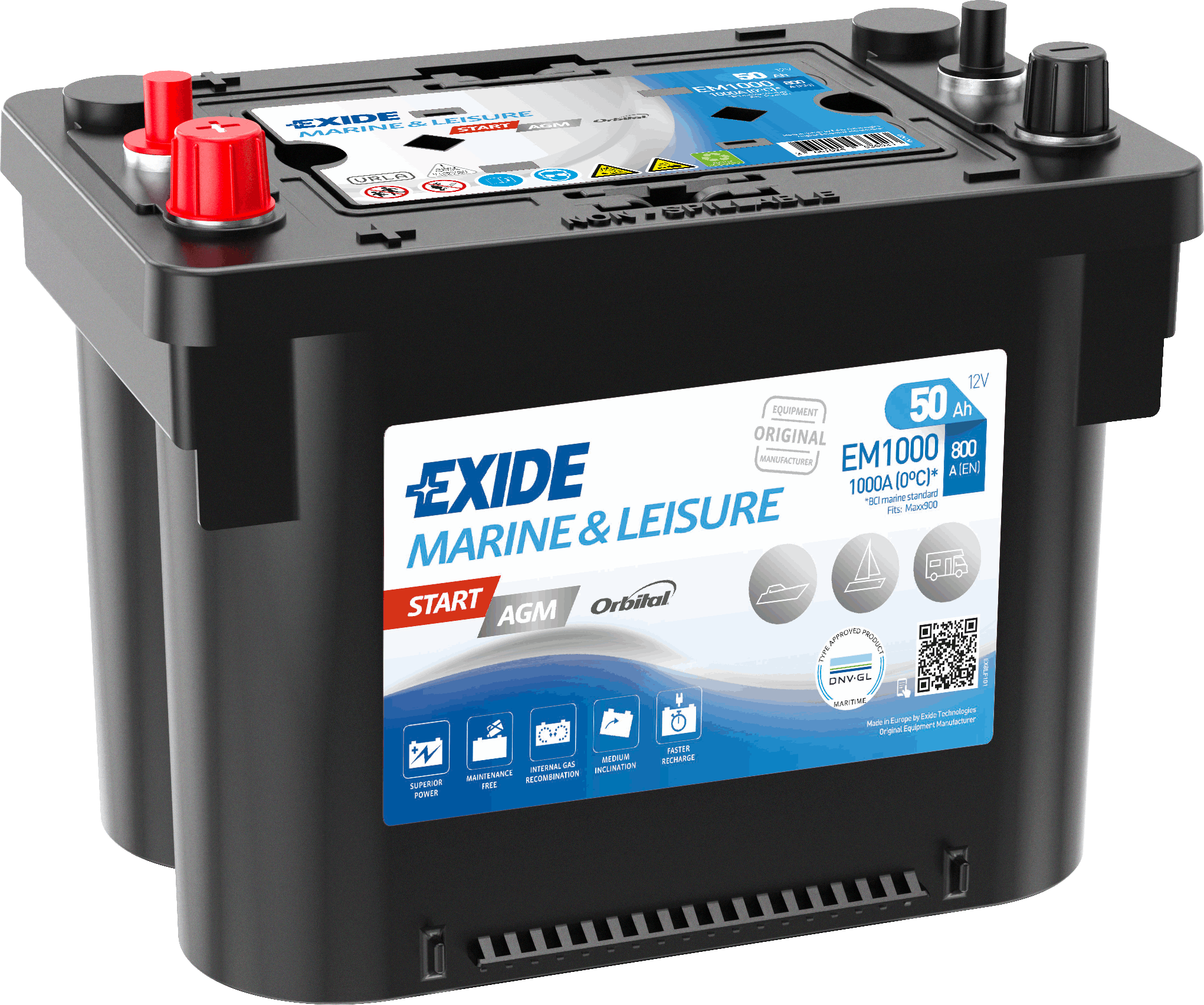 EM1000 benytter AGM-teknologi (Absorbent Glass Mat), der elektrolytten er bundet i glassfiberseparatorer. Dette gir høy startstrøm, lav selvutladning og god motstand mot vibrasjoner og helling – ideelt for bruk i båt og andre mobile installasjoner.