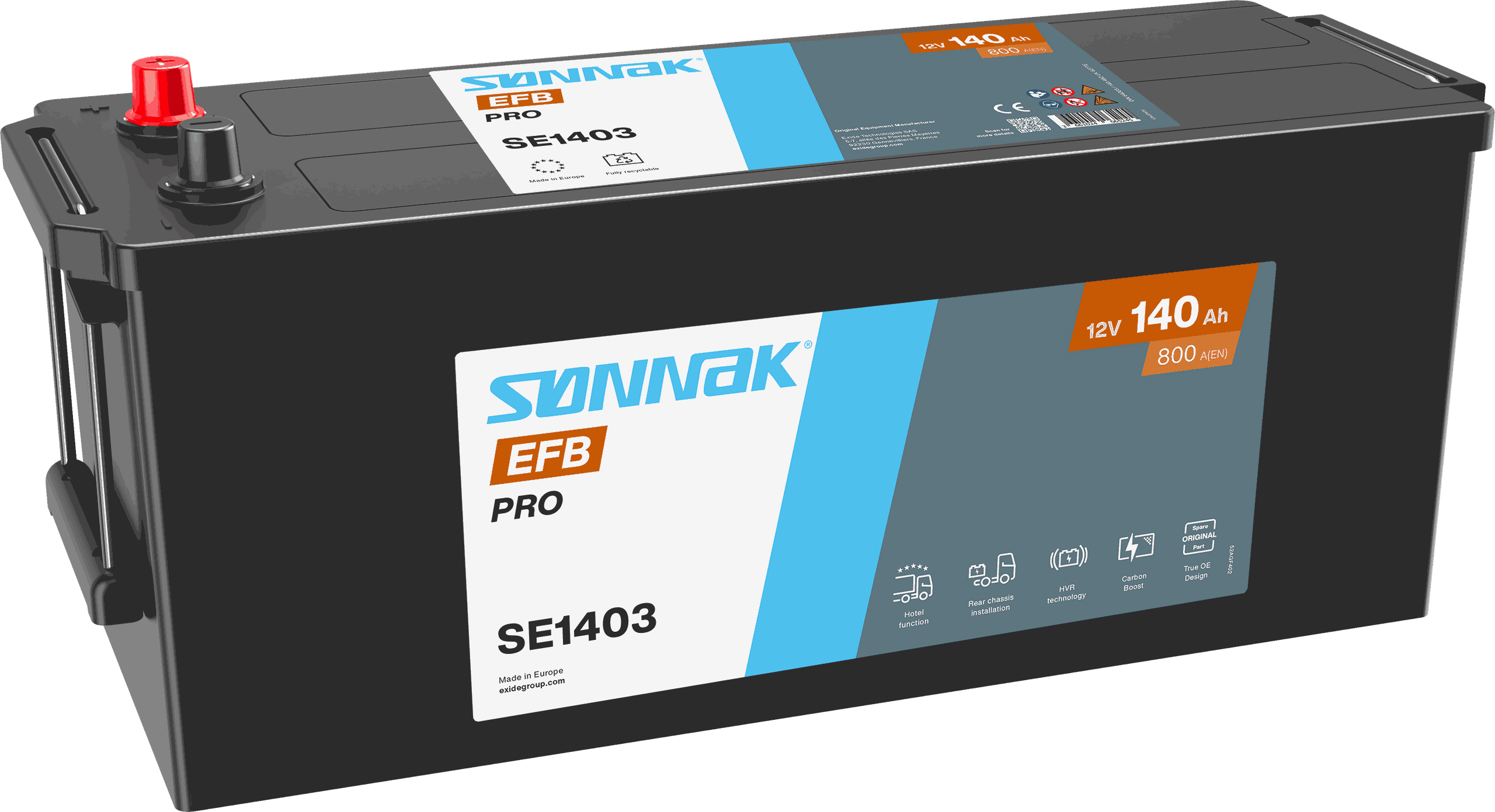 Sønnak EFB PRO SE1403 er et kraftig 12 V EFB-batteri for lastebil, buss, maskiner og landbruk – utviklet for høy startytelse og stabil drift i krevende bruksforhold med økt energibehov.