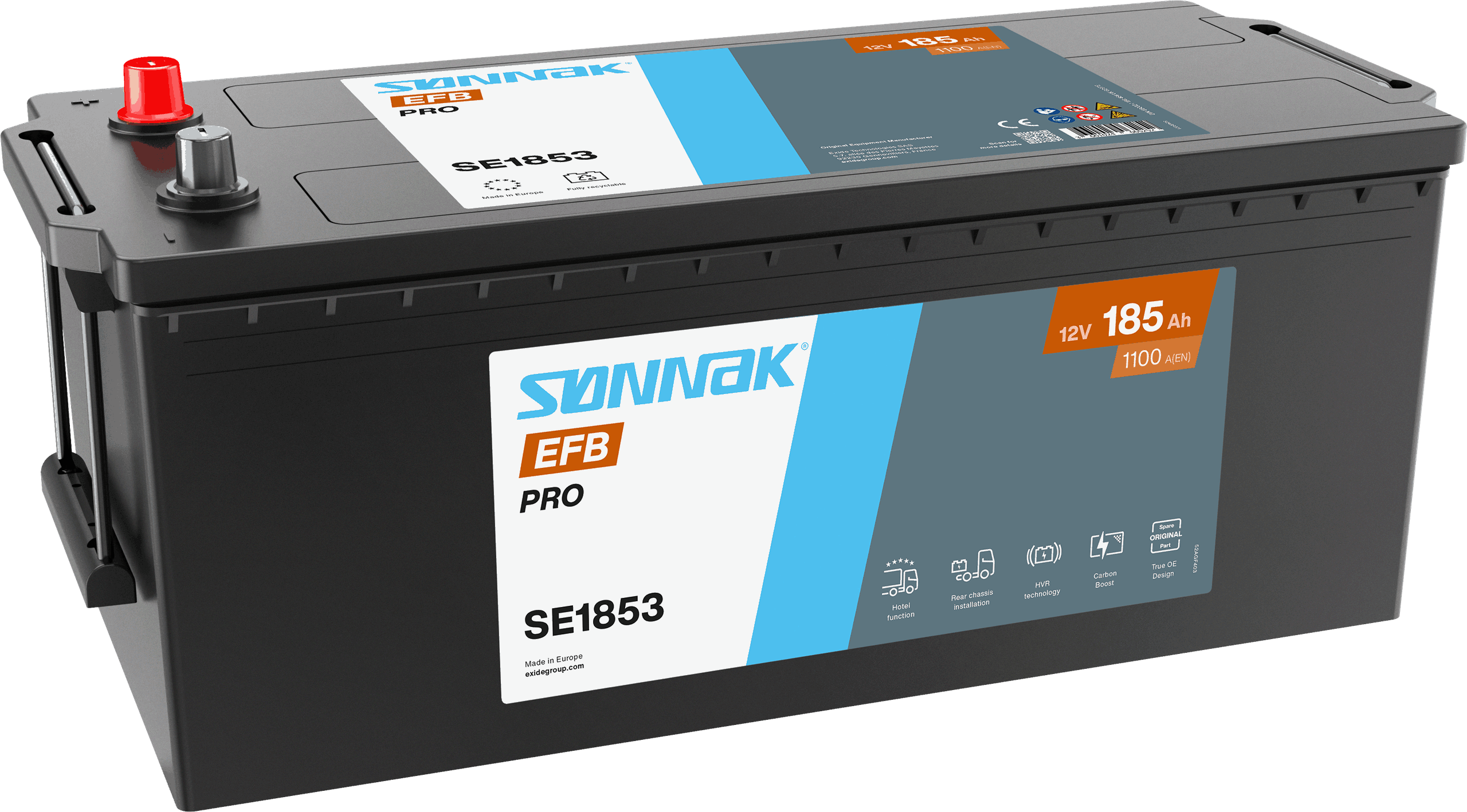 Sønnak EFB PRO SE1853 er et kraftig 12 V EFB-batteri for lastebil, buss, maskiner og landbruk – utviklet for høy startytelse og stabil drift i krevende bruksforhold med økt energibehov.