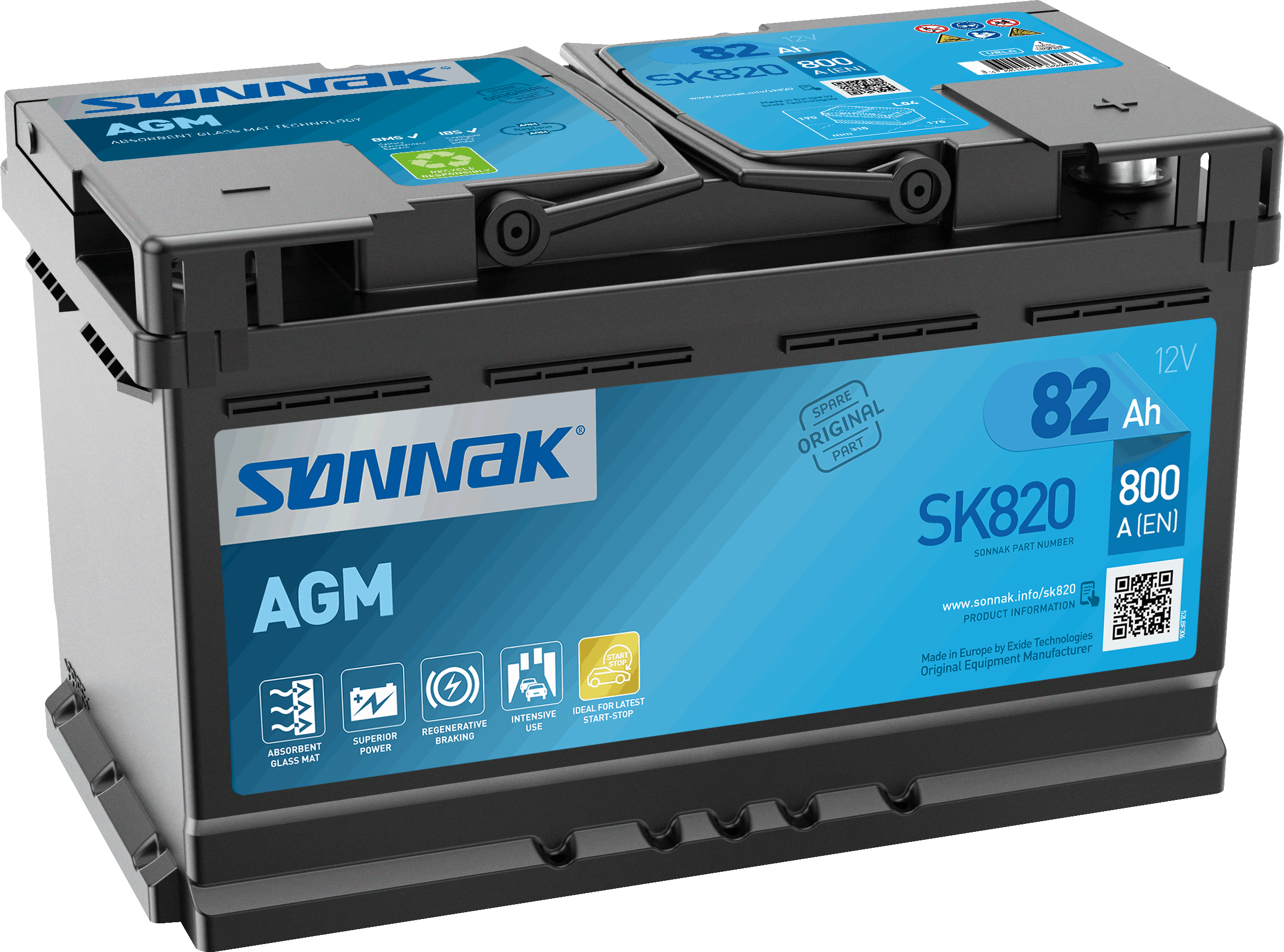 Sønnak AGM SK820 er et kraftig 12 V AGM startbatteri for personbil og lette kjøretøy, utviklet for høy startytelse og økt utholdenhet i kjøretøy med høyere energibehov (for eksempel start/stopp og mye elektrisk utstyr).