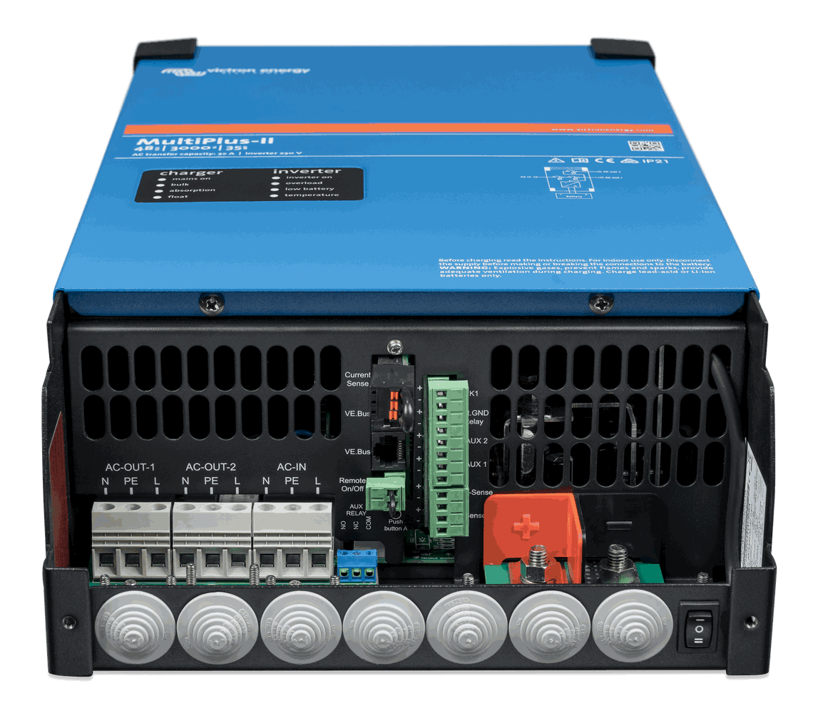 MultiPlus-II, er en allsidig omformer/lader som inkluderer alle funksjonene til MultiPlus, samt et eksternt strømsensoralternativ som utvider PowerControl- og PowerAssist-funksjonene til 50A og 100A, henholdsvis. MultiPlus-II er ideell for profesjonelle marine-, yacht-, kjøretøy- og landbaserte off-grid-applikasjoner. Den har også innebygd anti-øy-funksjonalitet og en stadig økende liste over landgodkjenninger for ESS-applikasjoner. Det er mulig med flere systemkonfigurasjoner. For mer detaljert informasjon, se ESS design- og konfigurasjonshåndboken.