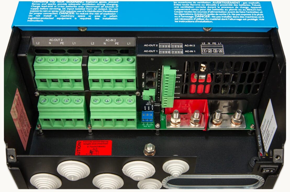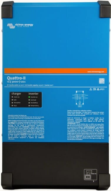 Som øvrige Quattro-modeller har denne versjonen to AC-innganger, for eksempel landstrøm og generator. Enheten velger automatisk aktiv kilde og sørger for sømløs overgang ved bortfall av strøm.