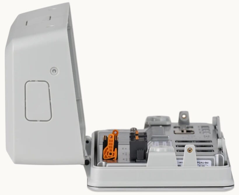 Veggkabinettet åpnes fra toppen med to skruer og kan foldes fremover uten å demonteres fra veggen. Det gir enkel tilgang til tilkoblinger og gjør det praktisk ved utvidelser og service.
