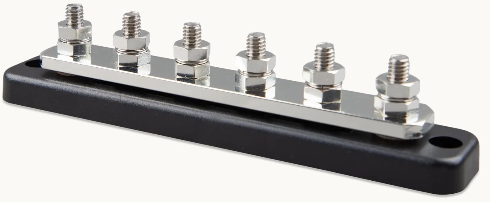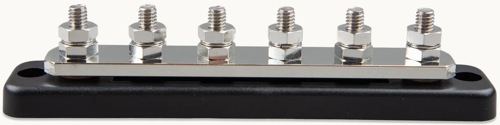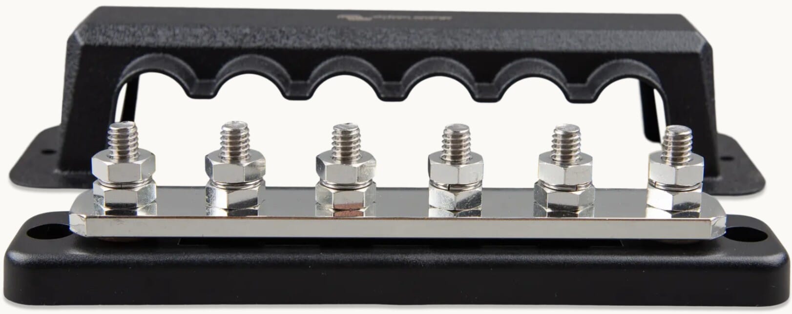 Koblingsskinne med deksel som tåler opptil 250A, 6 tilkoblingspunkter.